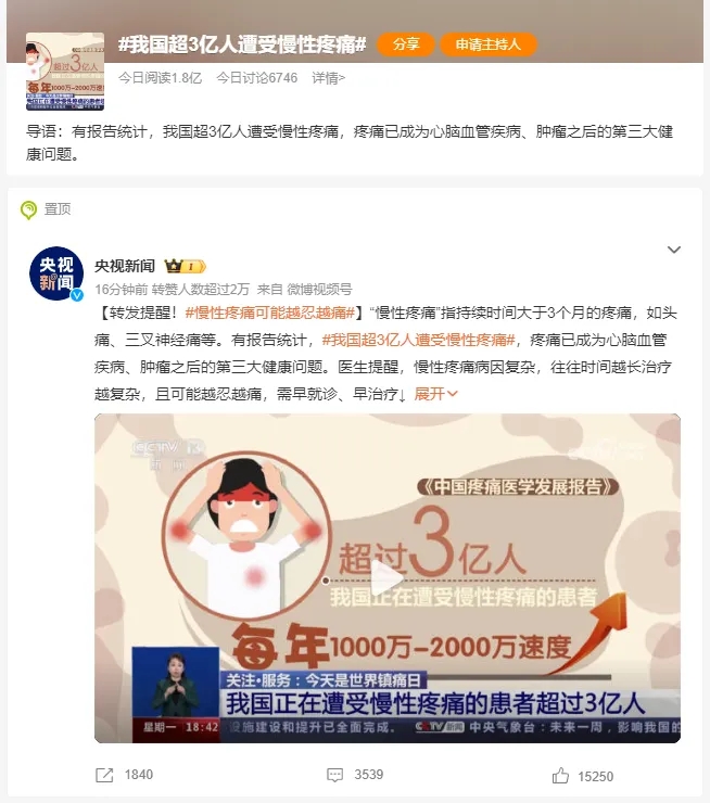 #我国超3亿人遭受慢性疼痛#话题登上微博热搜