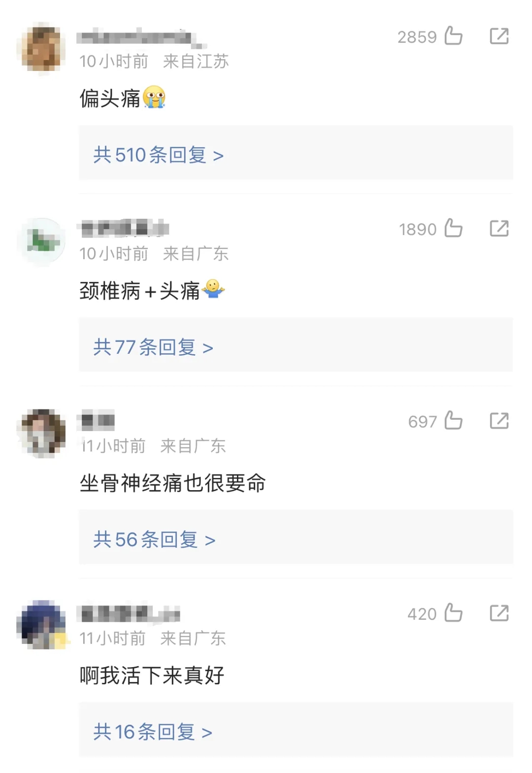 许多网友纷纷留言倾诉自己被疼痛折磨的痛苦经理,偏头痛、颈椎病、关节炎、肩周炎、坐骨神经痛……除了单纯病变部位的疼痛,慢性疼痛往往还给患者带来失眠、焦虑、社会交往方面的精神躯体障碍,造成极大痛苦。