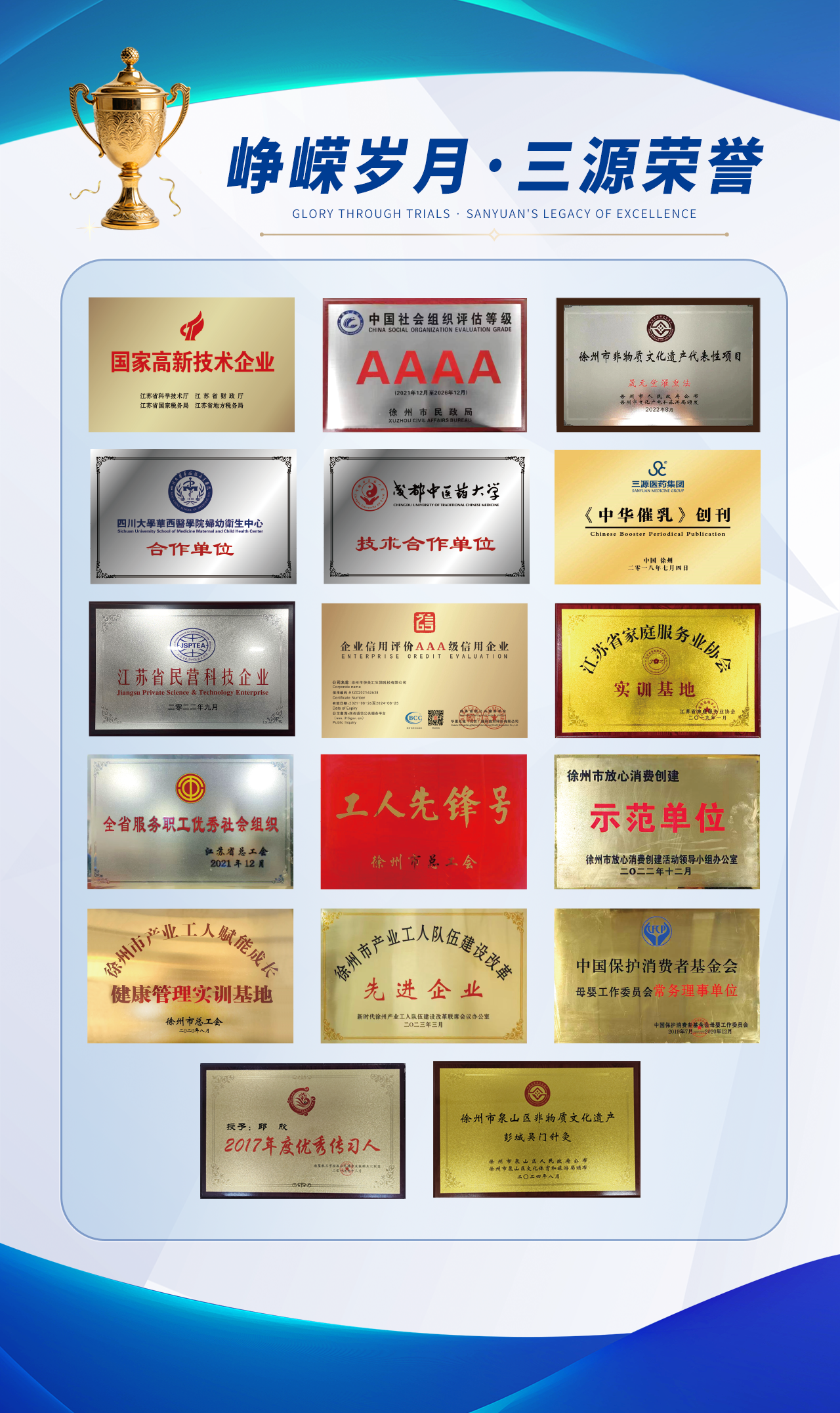 创办以来学校先后获得了“2011-2012年度文明诚信企业”、“发展家庭服务业先进单位”、“徐州市家庭服务业人才培训基地”、“徐州市工会干部教育培训基地”、“徐州产业工人健康管理实训基地”“徐州市产业工人赋能成长健康管理实训基地”、互联网营销师职业能力评价基地等荣誉。三源学校2021年被评为全省服务职工优秀社会组织,中国社会组织评估等级AAAA级等荣誉资质。